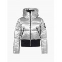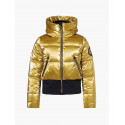 The bombardino jacket from Goldbergh in a comfortable regular fit is made from a combination of polyester and polyurethane with a partially recycled lining treated to prevent odors. The filling consists of high-quality certified duck down (RDS), providing warmth and lightness. The jacket features two outer pockets, two inner pockets, and a ski pass pocket on the sleeve. A fixed hood extending from the collar and knitted cuffs on the inside of the sleeves enhance protection against the cold