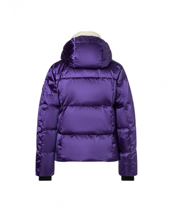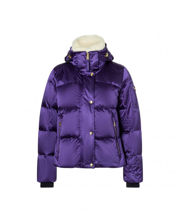 Veste sportive glamour, en stretch extensible 4 directions solide 20K / 20K avec panneaux à paillettes stretch sur le corps et les manches extérieures. Des touches d'élégance supplémentaires viennent avec des lignes de cristaux Swarovski découpées au laser sur les poches de poitrine et des bordures de ruban lustré doré. Il a un collier de boa détachable.